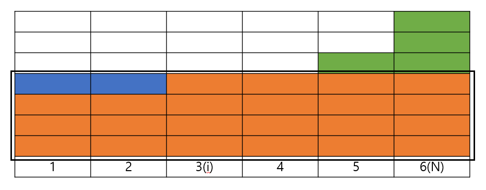 예를 들어 N=6이고 각 땅의 높이가 [3,3,4,4,5,7] 일때 아래 그림을 참고해봅시다.